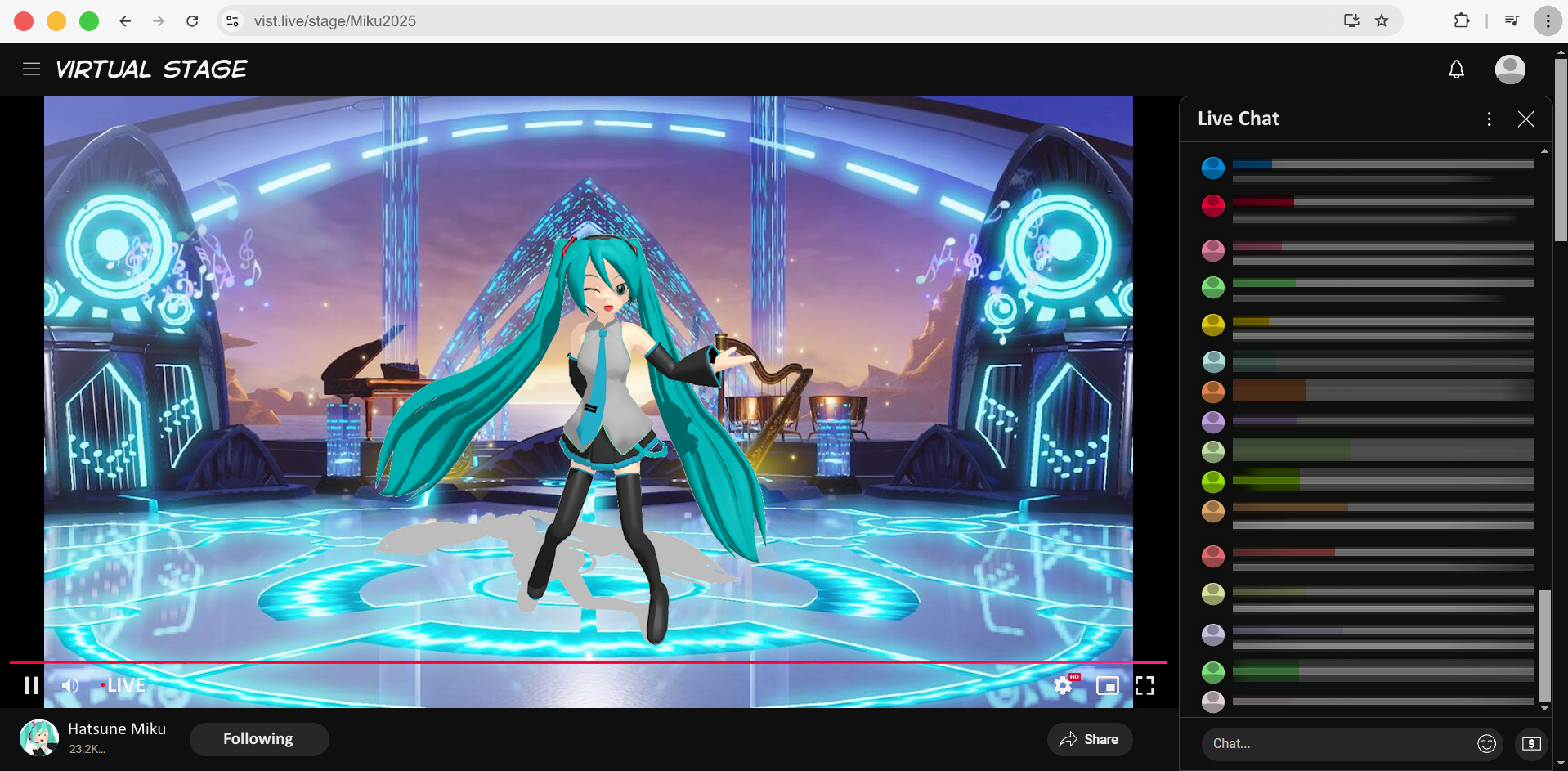 The stage will have a live stream player and a live chat just like a live stream, but it's no ordinary live stream. The stage itself is a full 3D enviornment that is rendered on the surver. When an artist is performing on stage, they send their motion capture input to the server in real time, and then the server renders it and presents it as a stream to the audience.